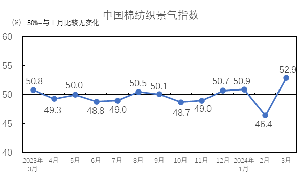 說明:中國棉紡織行業(yè)景氣指數(shù)采集自全國近500家次棉紡織廠,參考國家制造業(yè)PMI等指數(shù)制定方式,通過對多個主要指標加權計算得出,當指數(shù)高于50,表示棉紡織行業(yè)本月景氣程度好于上月,低于50則表示本月景氣程度不及上月。