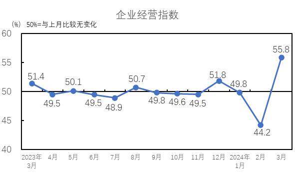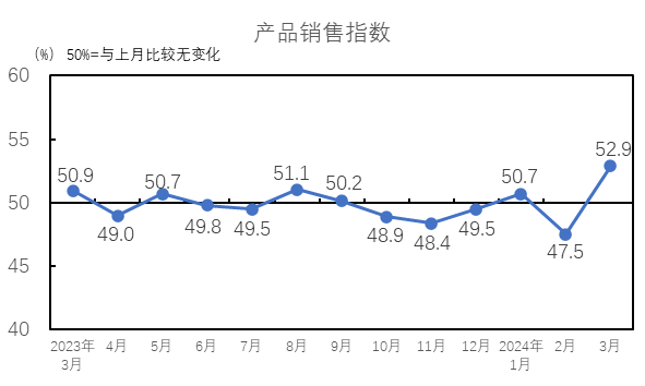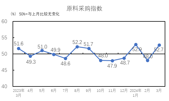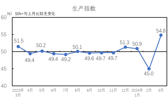 中國制造業(yè)采購經(jīng)理指數(shù)重返擴張區(qū)間。國家統(tǒng)計局發(fā)布的2024年3月中國制造業(yè)采購經(jīng)理指數(shù)為50.8%,較2月上升1.7個百分點。3月隨著企業(yè)在春節(jié)過后加快復工復產,企業(yè)生產經(jīng)營活動加快,市場活躍度提升,我國經(jīng)濟景氣水平回升。
