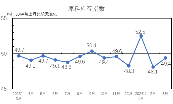 2024年3月,原料采購指數(shù)為52.7%,高于臨界點,較2月上升4.7個百分點。當月,棉花基本面行情風平浪靜,鄭棉略偏弱震蕩;滌綸短纖在原油價格偏強、節(jié)后需求不及預期等多空因素影響下區(qū)間震蕩;粘膠短纖價格在原料價格上漲和市場旺季不旺等因素的影響下先漲后降。具體看,國內3128級棉花現(xiàn)貨月均價16631元/噸,環(huán)比下降120元/噸,降幅0.72%;1.4D直紡滌綸短纖月均價7406元/噸,環(huán)比上漲8元/噸,漲幅0.1%;主流粘膠纖維月均價13452元/噸,環(huán)比上漲178元/噸,漲幅1.34%。由于節(jié)后恢復正常生產,企業(yè)原料采購較上月明顯增加,導致原料采購指數(shù)上升。