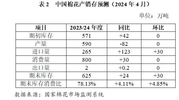 棉花產(chǎn)需平衡上調(diào)年度進(jìn)口量。考慮到棉花進(jìn)口量持續(xù)增加,本期上調(diào)2023/24年度棉花進(jìn)口量30萬噸至265萬噸;同步上調(diào)棉花期末庫存30萬噸至625萬噸;庫存消費(fèi)比上調(diào)4.85個(gè)百分點(diǎn)至78.13%,本年度棉花產(chǎn)需形勢進(jìn)一步寬松。