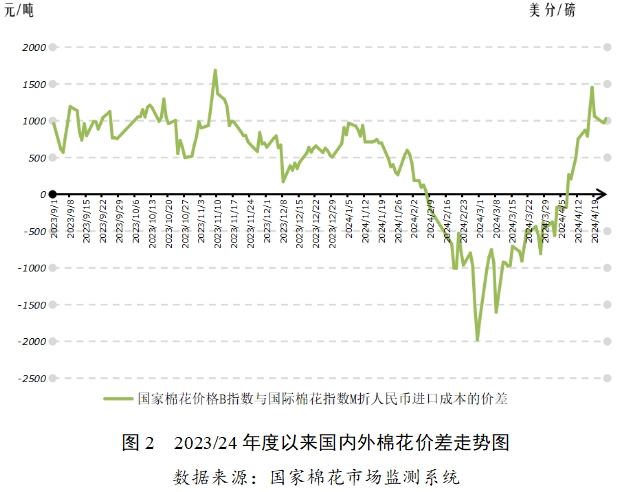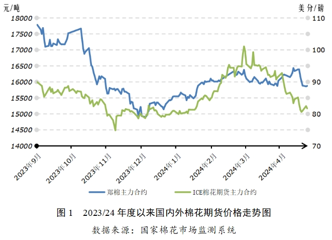 4月以來,美棉播種進(jìn)展總體順利,巴西、澳大利亞棉花豐產(chǎn)預(yù)期較強(qiáng),美國通脹超預(yù)期上漲、中東地區(qū)地緣政治沖突升級引發(fā)美元指數(shù)大漲,在全球棉花基本面轉(zhuǎn)向?qū)捤珊秃暧^面風(fēng)險(xiǎn)增大下,ICE期棉快速回落至年初水平。國內(nèi)棉花供給保持寬松,下游紡織生產(chǎn)環(huán)比略有好轉(zhuǎn),但隨著到港的國外棉花和棉紗持續(xù)增加,疊加國際棉價(jià)下行態(tài)勢,國內(nèi)棉價(jià)短暫上漲后也出現(xiàn)一定幅度下跌。