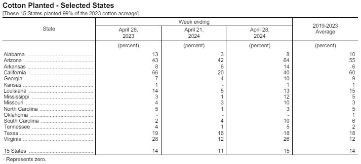 據(jù)美國農(nóng)業(yè)部網(wǎng)站4月29日消息,美國農(nóng)業(yè)部(USDA)在每周作物生長報(bào)告中公布稱,截至2024年4月28日當(dāng)周,美棉種植率為15%,前周為11%,去年同期為14%,五年均值為14%。
