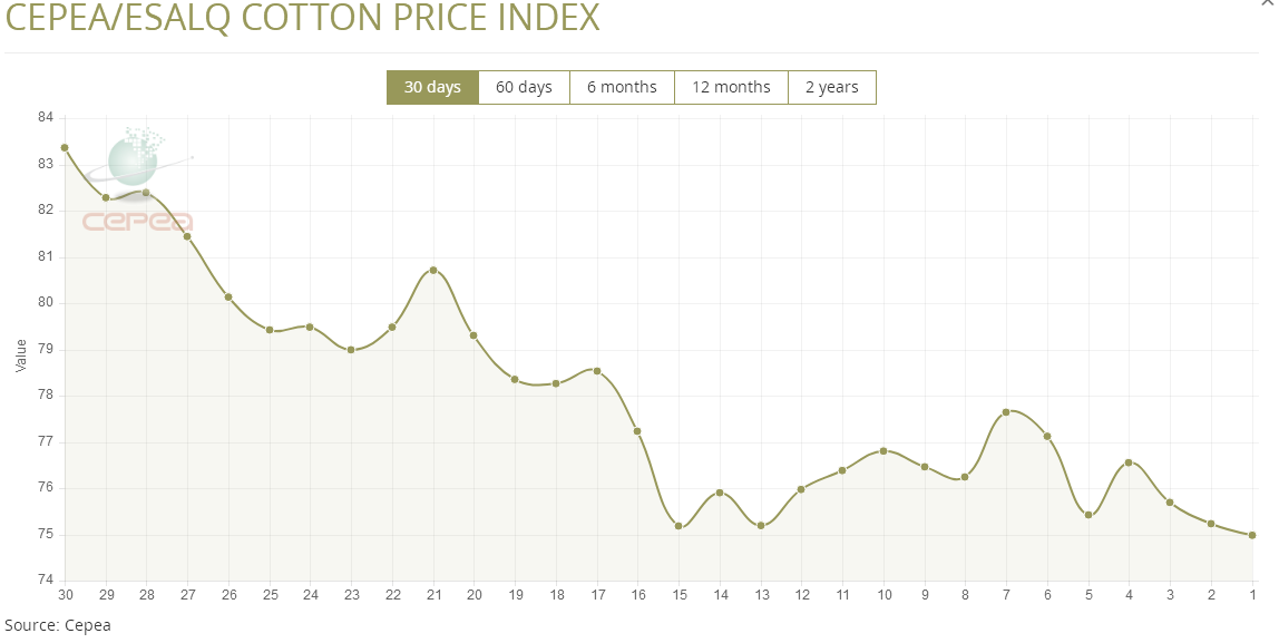 據(jù)外電5月7日消息,5月7日巴西CEPEA/ESALQ棉花價(jià)格指數(shù)報(bào)每磅74.98美分,較前一日下滑0.33%。