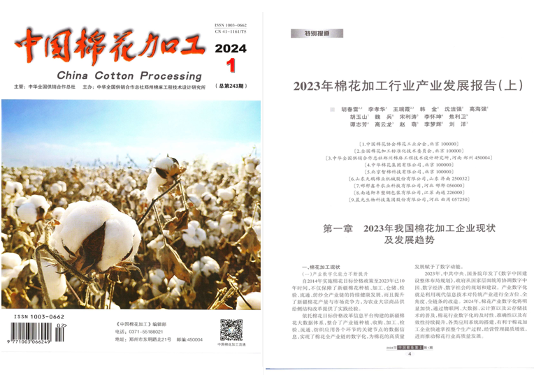 由中國棉花協(xié)會棉花工業(yè)分會和中華全國供銷合作總社鄭州棉麻工程技術設計研究所共同牽頭,全國棉花加工標準化技術委員會、中華棉花集團有限公司、北京智棉科技有限公司、山東天鵝棉業(yè)機械股份有限公司、石河子大學、南通御豐塑鋼包裝有限公司、晨光生物科技集團股份有限公司、邯鄲鑫牛農(nóng)業(yè)科技有限公司等單位組成專家組撰寫的《2023年棉花加工行業(yè)產(chǎn)業(yè)發(fā)展報告》(簡稱《報告》)在《中國棉花加工》期刊上正式發(fā)布。