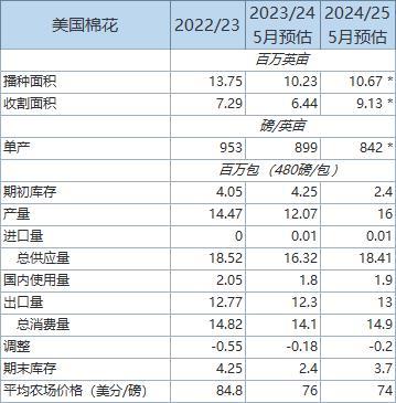 事件:美國農(nóng)業(yè)部5月供需報(bào)告發(fā)布,不僅包含對(duì)美國和全球2023/24年度作物平衡表的調(diào)整,還有對(duì)新季2024/25供需數(shù)據(jù)的首發(fā)預(yù)測。據(jù)USDA報(bào)告顯示,2024/25年度美國棉花種植面積、總產(chǎn)量、期末庫存均高于2023/24年度。全球看,2024/25年度棉花供應(yīng)量同比增加,年末庫存也高于2023/24年度。