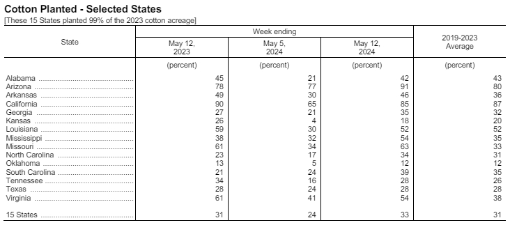 據(jù)美國農(nóng)業(yè)部網(wǎng)站5月13日消息,美國農(nóng)業(yè)部(USDA)在每周作物生長報告中公布稱,截至2024年5月12日當周,美棉種植率為33%,前周為24%,去年同期為31%,五年均值為31%。