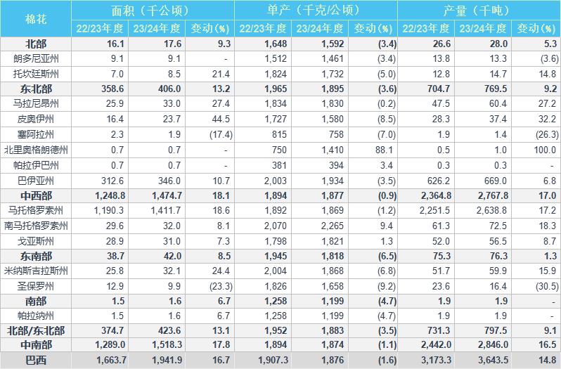 2023/24年度巴西棉花單產(chǎn)預估為1876千克/公頃,同比減少1.6%,2022/23年度為1907千克/公頃。