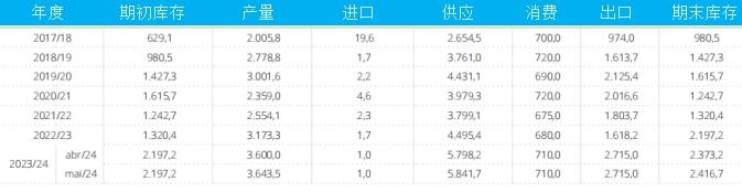 以下為巴西棉花供需平衡表(單位:千噸):