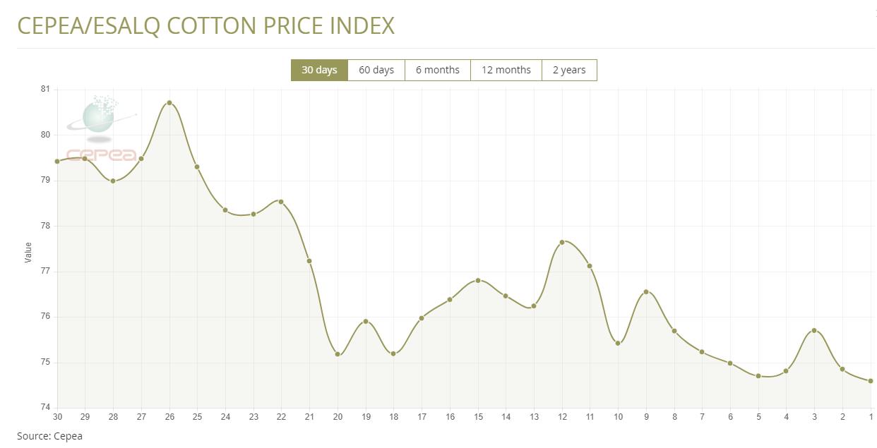 據(jù)外電5月14日消息,5月14日巴西CEPEA/ESALQ棉花價(jià)格指數(shù)報(bào)每磅74.59美分,較前一日下跌0.35%。