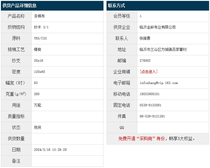 5月16日,臨沂金嶺布業(yè)有限公司滌棉紗卡T65/JC35 20x16 120x60 63" 3/1 260g/㎡,報(bào)價(jià)為7.2元/米,實(shí)際成交價(jià)以協(xié)商為準(zhǔn)。[點(diǎn)擊查看詳情]