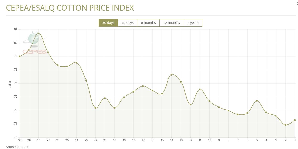 據(jù)外電5月15日消息,5月16日巴西CEPEA/ESALQ棉花價格指數(shù)報每磅74.28美分,較前一日上漲0.49%。