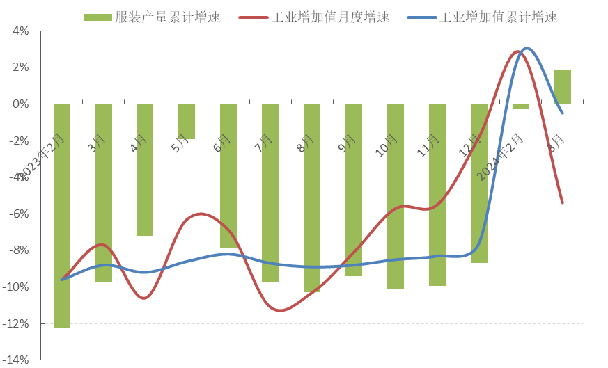 1季度,我國服裝行業(yè)有序復(fù)工復(fù)產(chǎn),在內(nèi)銷市場活力回升及出口小幅增長的帶動下,行業(yè)生產(chǎn)平穩(wěn)回升,規(guī)模以上企業(yè)工業(yè)增加值降幅較2023年有所收窄,服裝產(chǎn)量增速由降轉(zhuǎn)升。