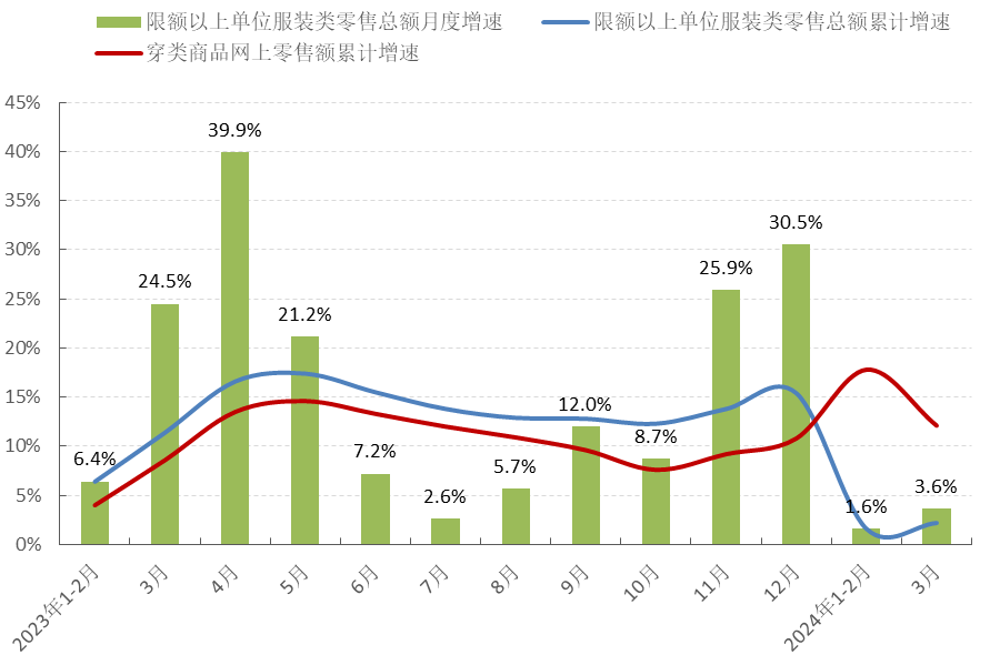 據(jù)國家統(tǒng)計局數(shù)據(jù),1-3月我國限額以上單位服裝商品零售額累計2732.3億元,同比增長2.2%,增速比2023年全年放緩13.2個百分點。其中3月限額以上單位服裝類商品零售額同比增長3.6%,增速比1-2月加快2個百分點。直播帶貨、即時零售等電商新模式對線上消費增長的拉動作用明顯,1-3月穿類商品網(wǎng)上零售額累計同比增長12.1%,增速比2023年全年加快1.3個百分點。