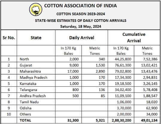 2023/24年度(10月至次年9月)迄今,印度棉花到貨量為28830200包或4901134噸。
