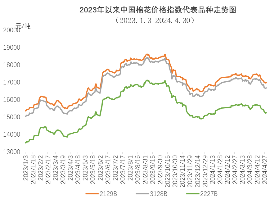 4月,中國棉花價格指數(shù)(CCIndex3128B)維持下跌走勢,28日跌至近4個月低點,為16661元/噸,30日收于16681元/噸,環(huán)比下跌214元。月內(nèi)前期紡織需求略有好轉(zhuǎn),紗線銷售較快,但中旬后需求轉(zhuǎn)弱,棉價下跌,企業(yè)對后市信心不足,多持觀望態(tài)度,原料采購偏謹(jǐn)慎,以隨用隨買逢低補(bǔ)庫為主。4月中國棉花價格指數(shù)(CCIndex3128B)月均價17007元/噸,環(huán)比下跌115元,同比上漲1419元。