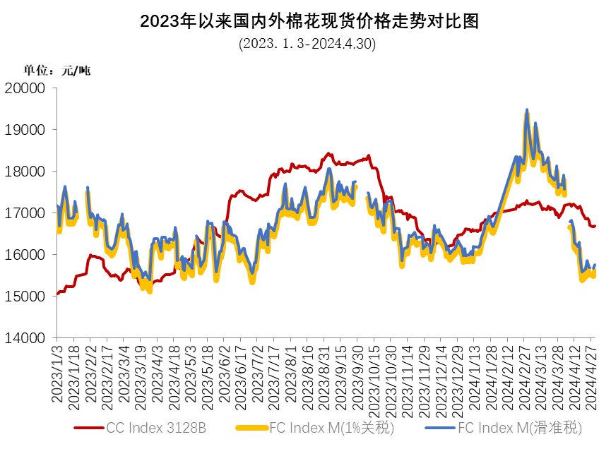 4月,美聯(lián)儲降息預(yù)期推遲,美元不斷走強(qiáng),美棉簽約數(shù)據(jù)偏弱,ICE期棉主力合約持續(xù)下跌,由月初最高92.9美分/磅跌至月末的78.03美分/磅,創(chuàng)近4個月以來新低。4月ICE期棉主力合約月均結(jié)算價84.35美分/磅,環(huán)比下跌9.57美分,跌幅10.2%。中國進(jìn)口棉價格指數(shù)FCIndexM月均92.64美分/磅,環(huán)比下跌11.42美分;月底89.36美分/磅,環(huán)比下跌11.32美分,1%關(guān)稅下折人民幣15592元/噸,低于同期中國棉花價格指數(shù)(CCIndex3128B)1089元。
