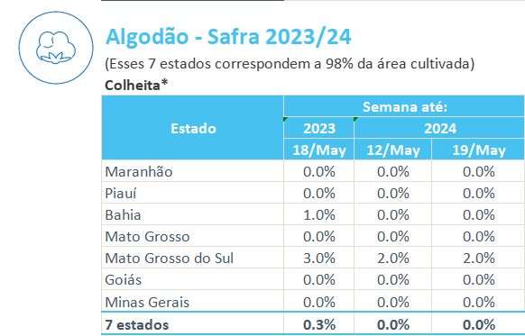據(jù)巴西農(nóng)業(yè)部下屬的國家商品供應(yīng)公司CONAB,截至5月19日,巴西棉花收割率為0.0%,上周為0.0%,去年同期為0.3%。