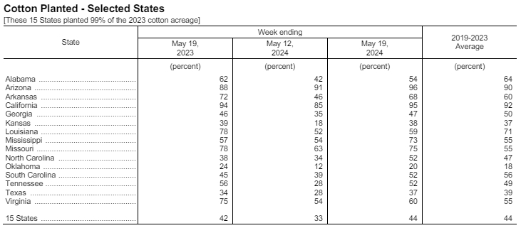 據(jù)美國(guó)農(nóng)業(yè)部網(wǎng)站5月20日消息,美國(guó)農(nóng)業(yè)部(USDA)在每周作物生長(zhǎng)報(bào)告中公布稱,截至2024年5月19日當(dāng)周,美棉種植率為44%,前周為33%,去年同期為42%,五年均值為44%。
