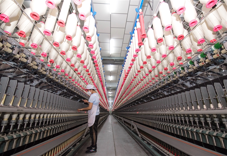 5月21日,昌吉溢達紡織有限公司智能示范車間,員工正在整理紡線。近年來,該公司積極加大科技創(chuàng)新力度,構(gòu)建智慧化的紡紗生產(chǎn)線和管理模式,智能示范車間應用大數(shù)據(jù)、人工智能、5G等先進技術,梳棉、條卷、精梳等8道生產(chǎn)工序都已實現(xiàn)智能化生產(chǎn),年產(chǎn)量提升25%。