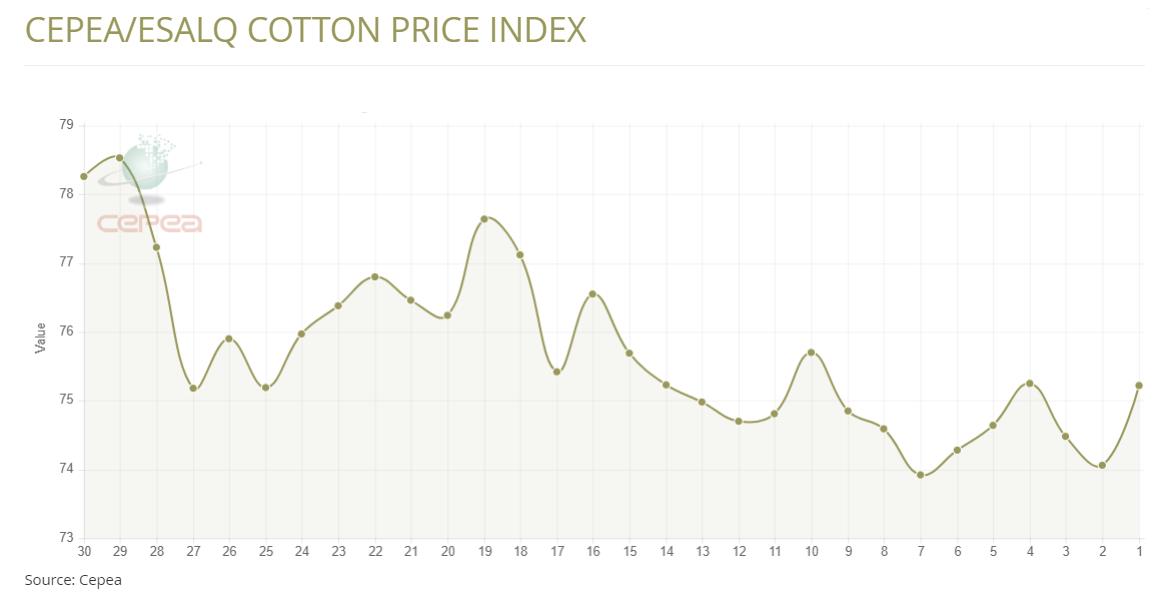 據(jù)外電5月23日消息,5月23日巴西CEPEA/ESALQ棉花價格指數(shù)報每磅75.22美分,較前一日上漲1.57%。