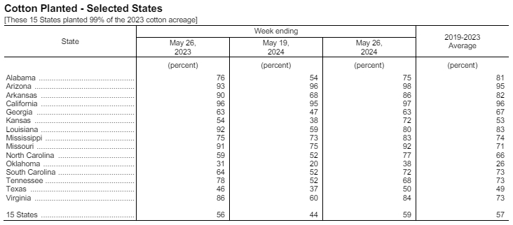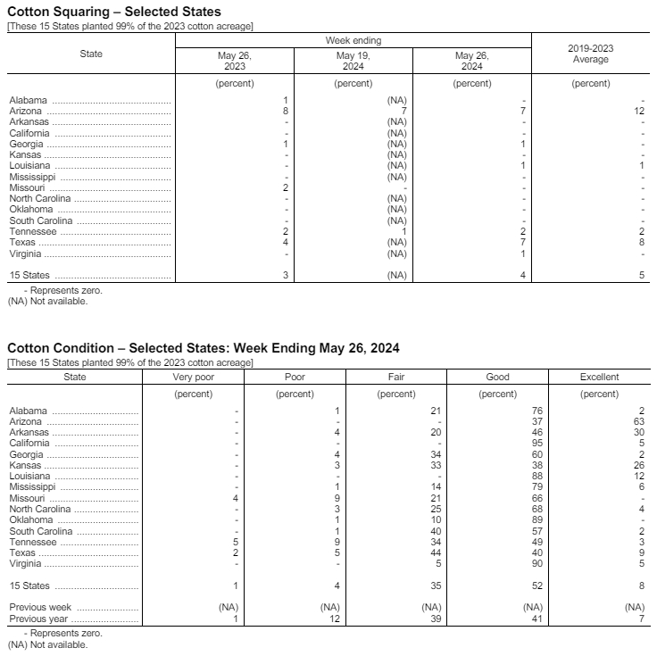 據(jù)美國農(nóng)業(yè)部網(wǎng)站5月28日消息,美國農(nóng)業(yè)部(USDA)在每周作物生長報告中公布稱,截至2024年5月26日當(dāng)周,美棉種植率為59%,前周為44%,去年同期為56%,5年均值為57%。美棉現(xiàn)蕾率為4%,上年同期為3%,5年均值為5%。美棉優(yōu)良率為60%,上年同期為48%。