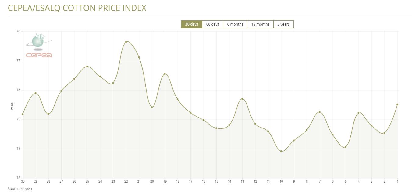 據外電5月28日消息,5月28日巴西CEPEA/ESALQ棉花價格指數報每磅75.51美分,較前一日上漲1.30%。