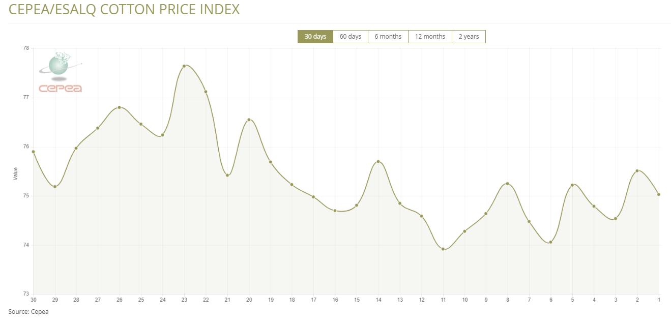 據(jù)外電5月29日消息,5月29日巴西CEPEA/ESALQ棉花價格指數(shù)報每磅75.03美分,較前一日下跌0.64%。