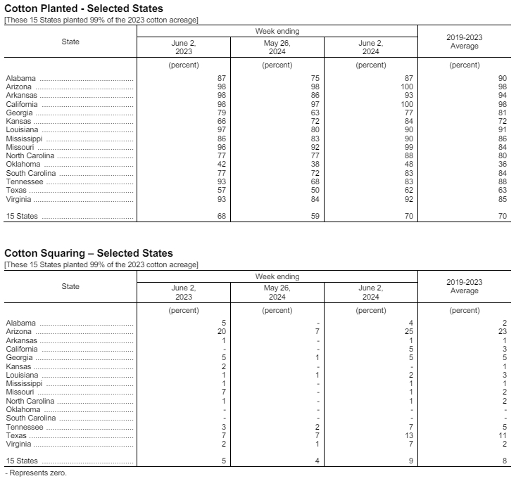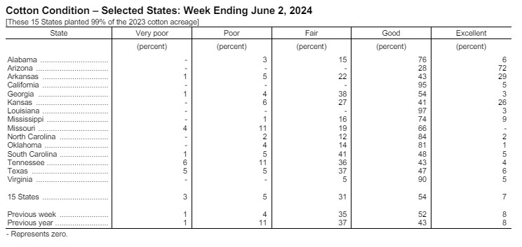 據(jù)美國農(nóng)業(yè)部網(wǎng)站6月3日消息,美國農(nóng)業(yè)部(USDA)在每周作物生長報告中公布稱,截至6月2日當(dāng)周,美棉種植率為70%,前周為59%,去年同期為68%,五年均值為70%。美棉現(xiàn)蕾率為9%,前周為4%,上年同期為5%,五年均值為8%。美棉優(yōu)良率為61%,前周為60%,上年同期為51%。