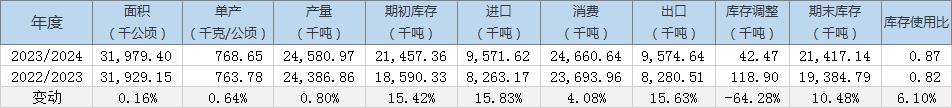 2023/24年度全球棉花期末庫存預估小幅上調(diào)至2141.71萬噸,同比增加10.48%,2022/23年度期末庫存預估為1938.48萬噸。