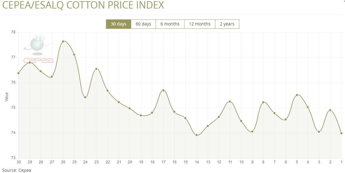 據(jù)外電6月4日消息,6月4日巴西CEPEA/ESALQ棉花價格指數(shù)報每磅73.99美分,較前一日下跌1.23%。