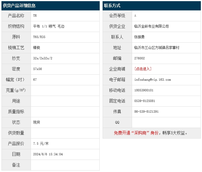 6月6日,臨沂金嶺布業(yè)有限公司滌粘平布T65/R35 32s/2x32s/2 57x56 67" 1/1 噴氣 毛邊,報價為7.5元/米,實際成交價以協(xié)商為準。[點擊查看詳情]