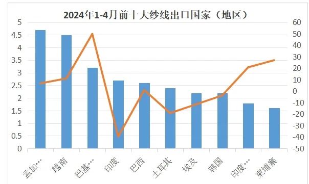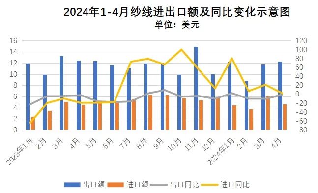 1-4月對(duì)孟出口紗線4.7億美元,同比增長6.7%;4月對(duì)孟出口紗線1.4億美元,同比增長11%。