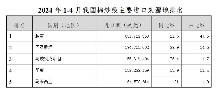 從大類產(chǎn)品看,2024年1-4月進(jìn)口棉紗線13.3億美元,同比增長24.9%,進(jìn)口數(shù)量54.9萬噸,同比增長33.4%;進(jìn)口化纖4.8億美元,同比上漲16.8%;進(jìn)口絲線和羊毛、動(dòng)物紗線分別為102.4萬美元和0.5億美元,同比增長30.3%和9.7%。我國紗線進(jìn)口以棉紗線為主,占紗線進(jìn)口總額的70%。