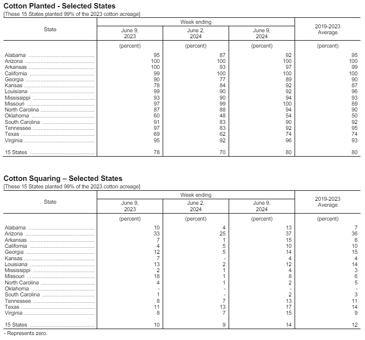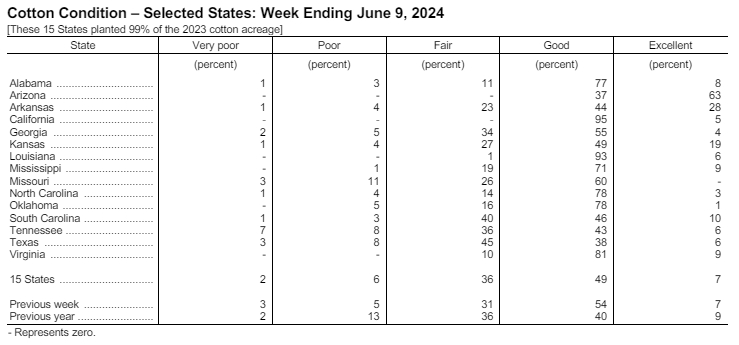 據(jù)美國農(nóng)業(yè)部網(wǎng)站6月10日消息,美國農(nóng)業(yè)部(USDA)在每周作物生長報告中公布稱,截至6月9日當(dāng)周,美棉種植率為80%,前周為70%,去年同期為78%,五年均值為80%。美棉現(xiàn)蕾率為14%,前周為9%,上年同期為10%,五年均值為12%。美棉優(yōu)良率為56%,前周為61%,上年同期為49%。