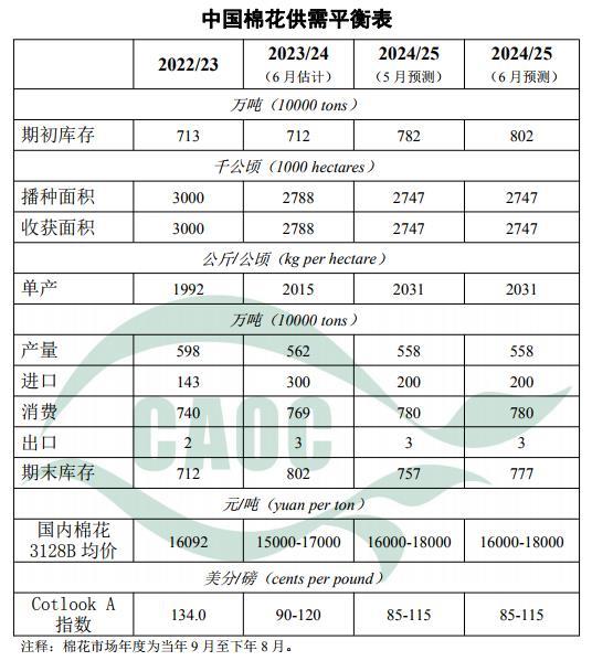 受內(nèi)外棉價(jià)差持續(xù)影響,棉花進(jìn)口高于預(yù)期,2023年9月-2024年4月累計(jì)達(dá)248萬(wàn)噸,本月將2023/24年度進(jìn)口量上調(diào)20萬(wàn)噸至300萬(wàn)噸,期末庫(kù)存上調(diào)至802萬(wàn)噸。本月預(yù)測(cè),2024/25年度中國(guó)棉花供需形勢(shì)與上月保持一致。當(dāng)前,新疆棉花普遍處于現(xiàn)蕾期,黃河流域和長(zhǎng)江流域棉花大部分處于第六真葉至現(xiàn)蕾期,全國(guó)棉區(qū)光溫適宜,利于棉花苗期生長(zhǎng),長(zhǎng)勢(shì)好于上年,后期需持續(xù)關(guān)注天氣對(duì)單產(chǎn)的影響。