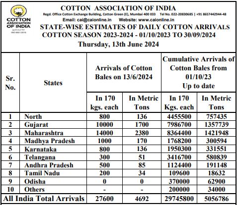 2023/24年度(10月至次年9月)迄今,印度棉花到貨量為29745800包或5056786噸。