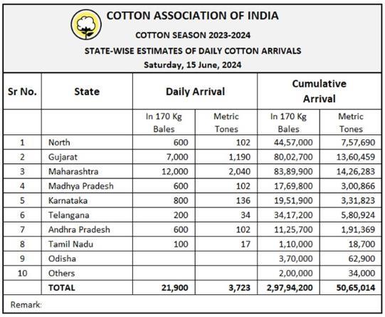 據(jù)外電6月15日消息,印度棉花協(xié)會(CAI)公布,6月15日印度棉花到貨量預估為21900包(每包170公斤)或3723噸。
