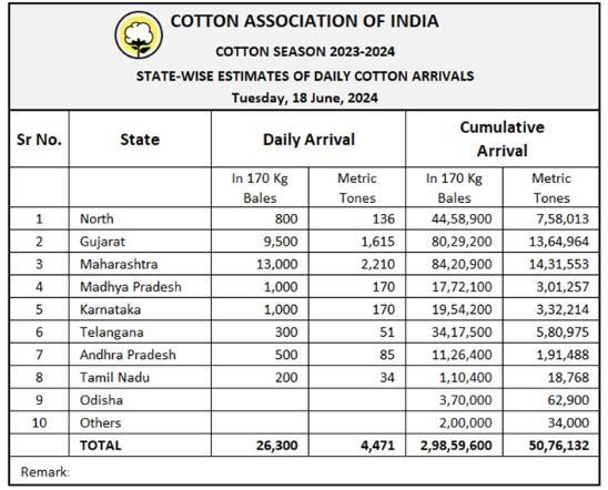 2023/24年度(10月至次年9月)迄今,印度棉花到貨量為29859600包或5076132噸。