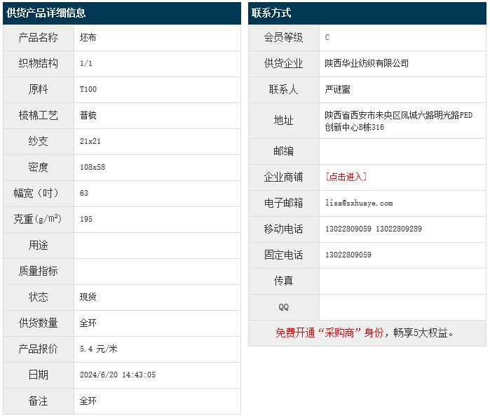 6月20日,陜西華業(yè)紡織有限公司純滌布T100 21x21 108x58 63" 195g/㎡,報(bào)價(jià)為5.4元/米,實(shí)際成交價(jià)以協(xié)商為準(zhǔn)。[點(diǎn)擊查看詳情]
