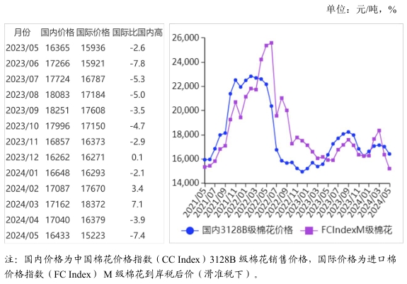 (一)國內(nèi)棉價(jià)繼續(xù)下跌。本月,紡織市場(chǎng)進(jìn)入傳統(tǒng)淡季,新增訂單少,疊加下游原料庫存較高,紡織廠補(bǔ)庫意愿較往年偏低,棉價(jià)繼續(xù)下跌。據(jù)《中國棉花工業(yè)庫存調(diào)查報(bào)告》數(shù)據(jù),5月初全國棉花工業(yè)庫存約80.2萬噸,環(huán)比增加3.9%,同比增加35.5%。采購意向調(diào)查顯示,5月初準(zhǔn)備采購棉花的企業(yè)占48%,同比減少10.0個(gè)百分點(diǎn),比近5年同期較少15.8個(gè)百分點(diǎn)。5月,國內(nèi)3128B級(jí)棉花月均價(jià)每噸16433元,環(huán)比跌3.6%,同比漲0.4%。鄭棉期貨主力合約(CF409)月結(jié)算價(jià)每噸15510元,環(huán)比跌1.2%,同比跌1.5%。