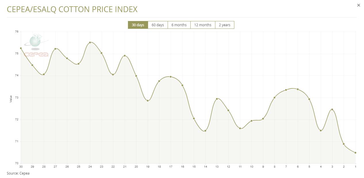 據(jù)外電7月1日消息,7月1日巴西CEPEA/ESALQ棉花價(jià)格指數(shù)報(bào)每磅70.49美分,較前一日下滑0.56%。