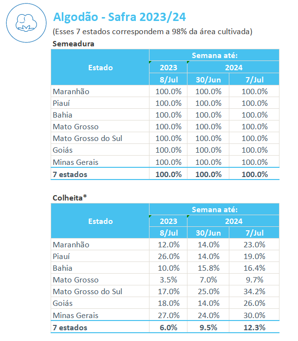 據(jù)巴西農(nóng)業(yè)部下屬的國家商品供應(yīng)公司CONAB,截至7月7日,巴西棉花收割率為12.3%,上周為9.5%,去年同期為6.0%。