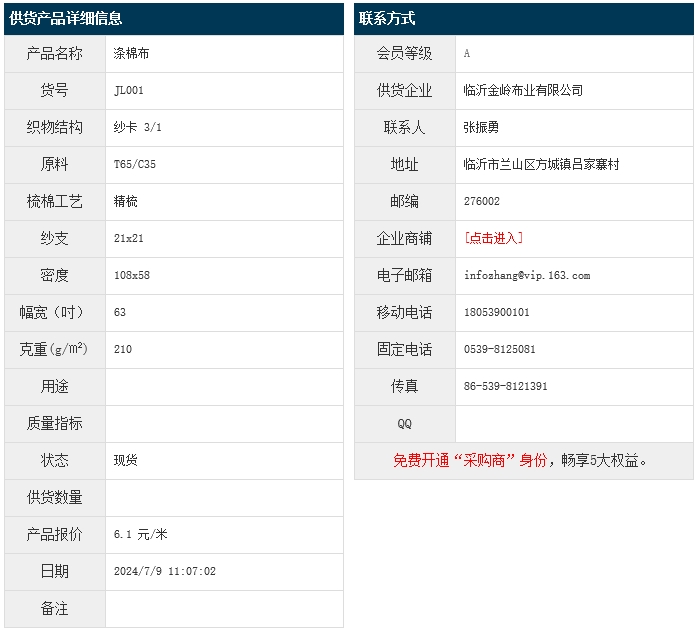 7月9日,臨沂金嶺布業(yè)有限公司滌棉紗卡T65/JC35 21x21 108x58 63" 3/1 210g/㎡,報(bào)價(jià)為6.1元/米,實(shí)際成交價(jià)以協(xié)商為準(zhǔn)。[點(diǎn)擊查看詳情]