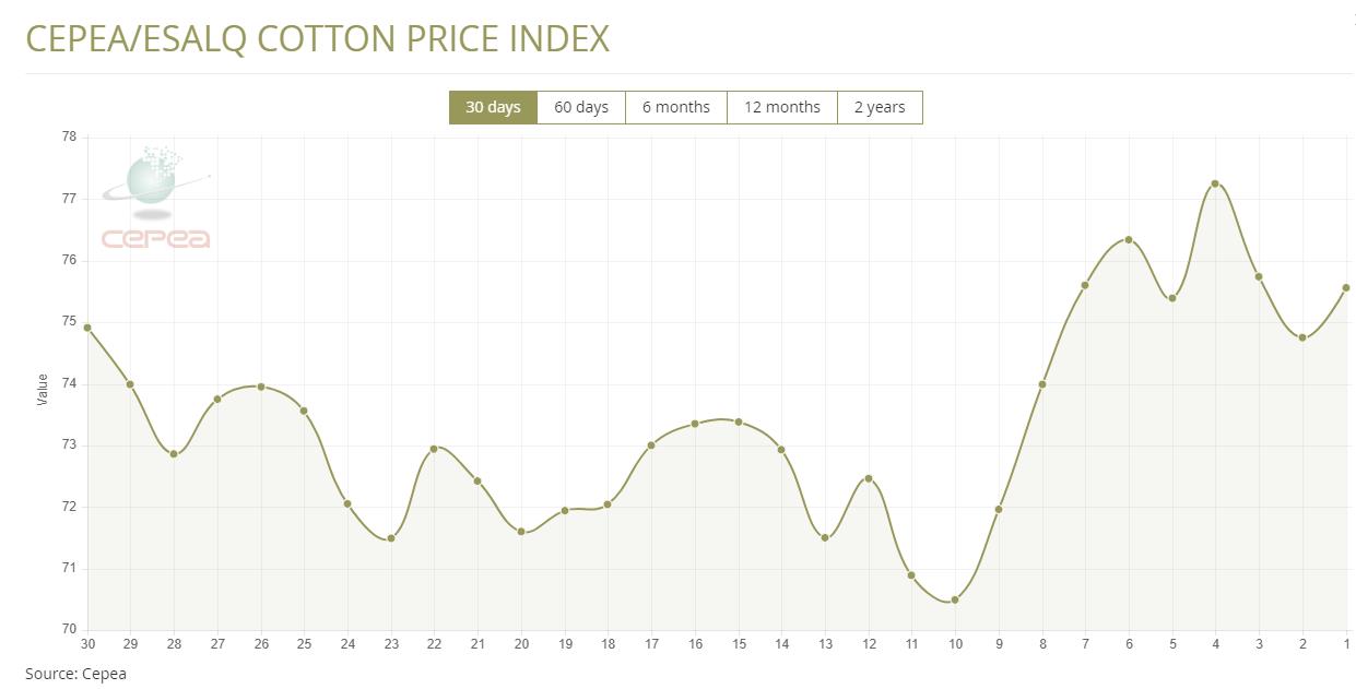 據(jù)外電7月12日消息,7月12日巴西CEPEA/ESALQ棉花價(jià)格指數(shù)報(bào)每磅75.56美分,較前一日下跌1.08%。