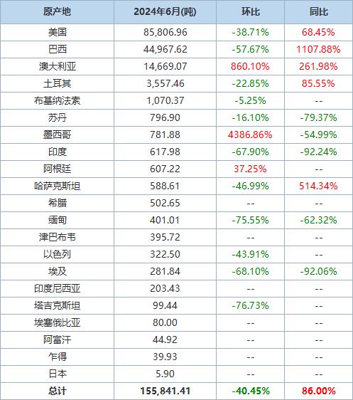據(jù)海關(guān)統(tǒng)計數(shù)據(jù),2024年6月我國進口棉花約16萬噸,環(huán)比減少約10萬噸,同比增長約86.0%。