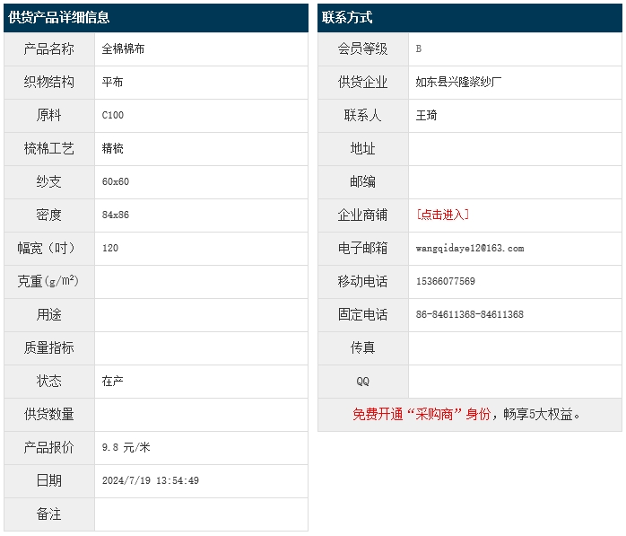 7月19日,如東縣興隆漿紗廠純棉平布JC100 60x60 84x86 120",報價為9.8元/米,實際成交價以協(xié)商為準。[點擊查看詳情]