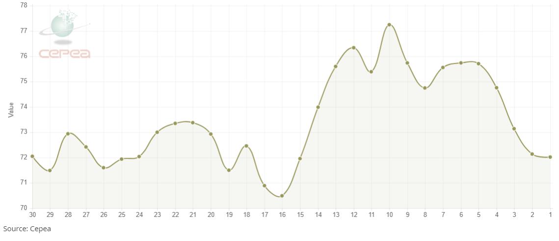 據(jù)外電7月22日消息,7月22日巴西CEPEA/ESALQ棉花價(jià)格指數(shù)報(bào)每磅72.02美分,較前一日下跌0.17%。