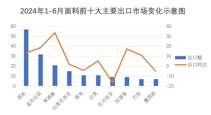 亞洲是我國面料出口的主要市場,2024年1-6月我國對亞洲國家出口面料227.4億美元,占面料出口總額的68.1%。在前十大目標市場出口中,亞洲市場占7席。越南作為我國面料出口最大的單一市場,占我國面料對全球出口的17.1%,出口額56.9億美元,同比增長13.1%。