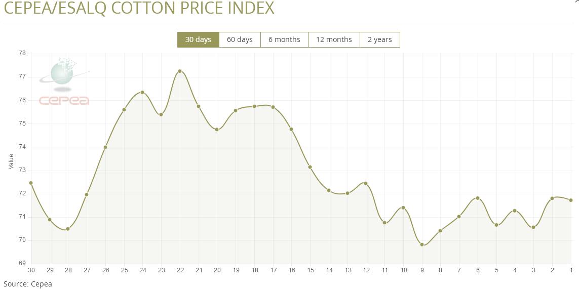 據(jù)外電8月7日消息,8月7日巴西CEPEA/ESALQ棉花價格指數(shù)報每磅71.72美分,較前一日下跌0.11%。