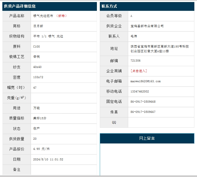 8月10日,寶雞昌新布業(yè)有限公司純棉平布C100 40x40 133x72 47" 1/1 噴氣 光邊,報價為4.95元/米,實際成交價以協(xié)商為準。[點擊查看詳情]